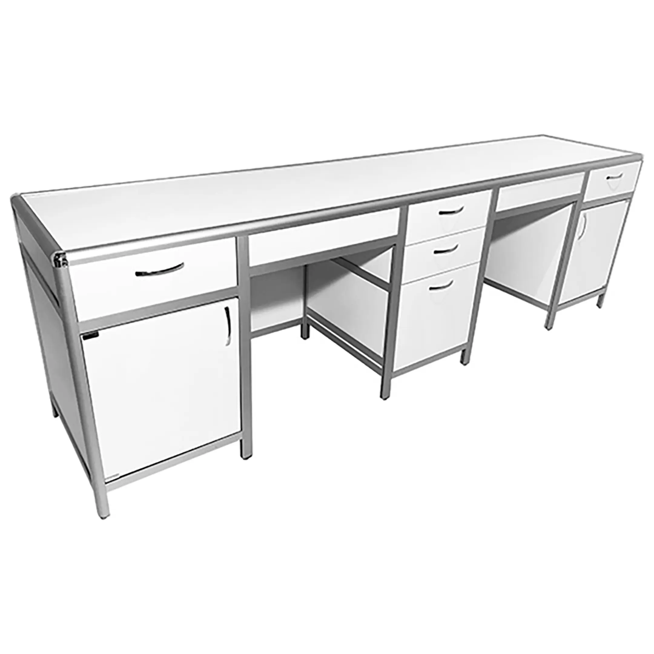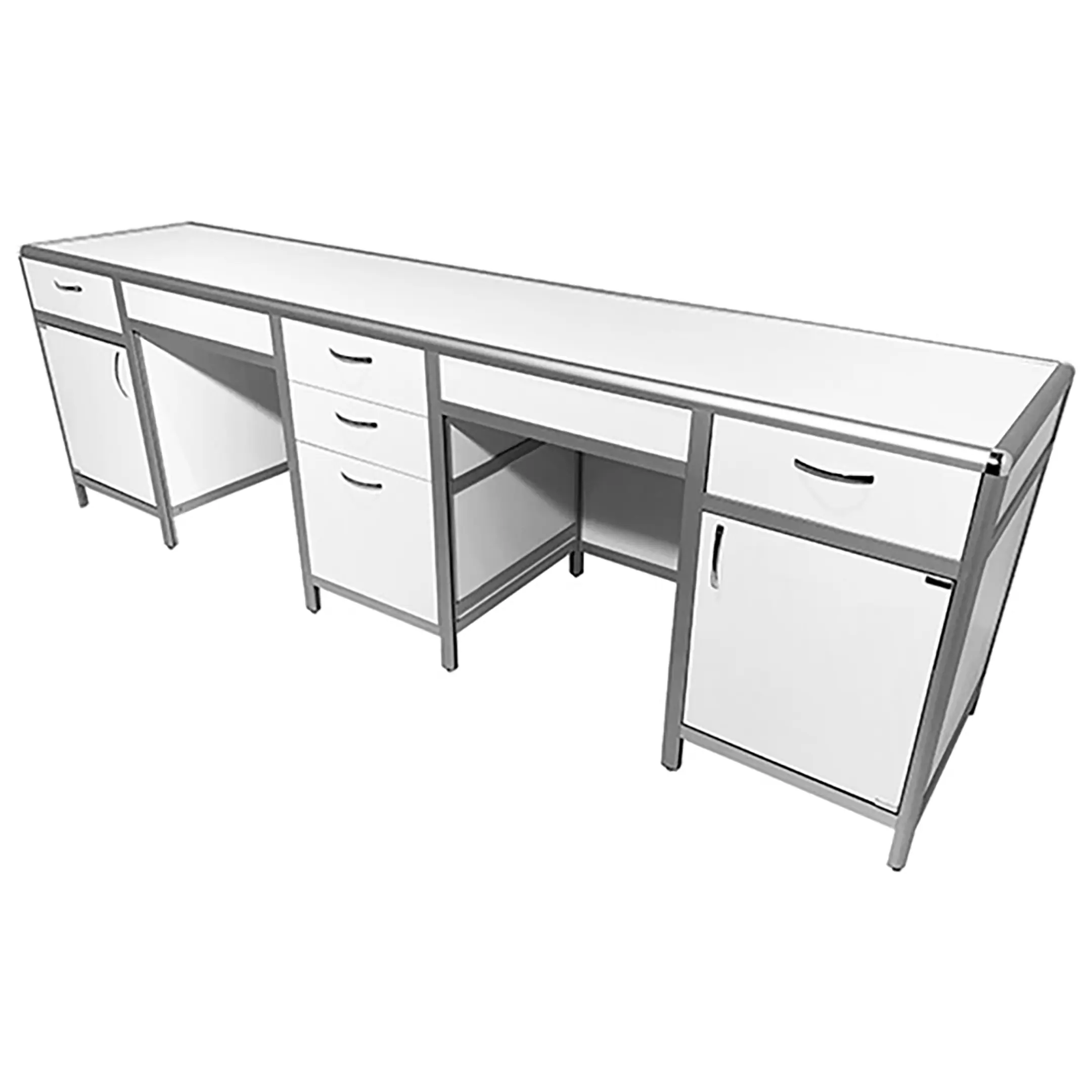 Стол лабораторный MED 10.010al (белый) — это идеальное решение для создания удобного и функционального рабочего места сотрудников в лабораториях и медицинских учреждениях. Модель оснащена центральной тумбой с тремя выдвижными ящиками и двумя боковыми тумбами с комбинированной системой хранения. Каркас выполнен из алюминиевого профиля, столешница из ЛДСП толщиной 16 мм.