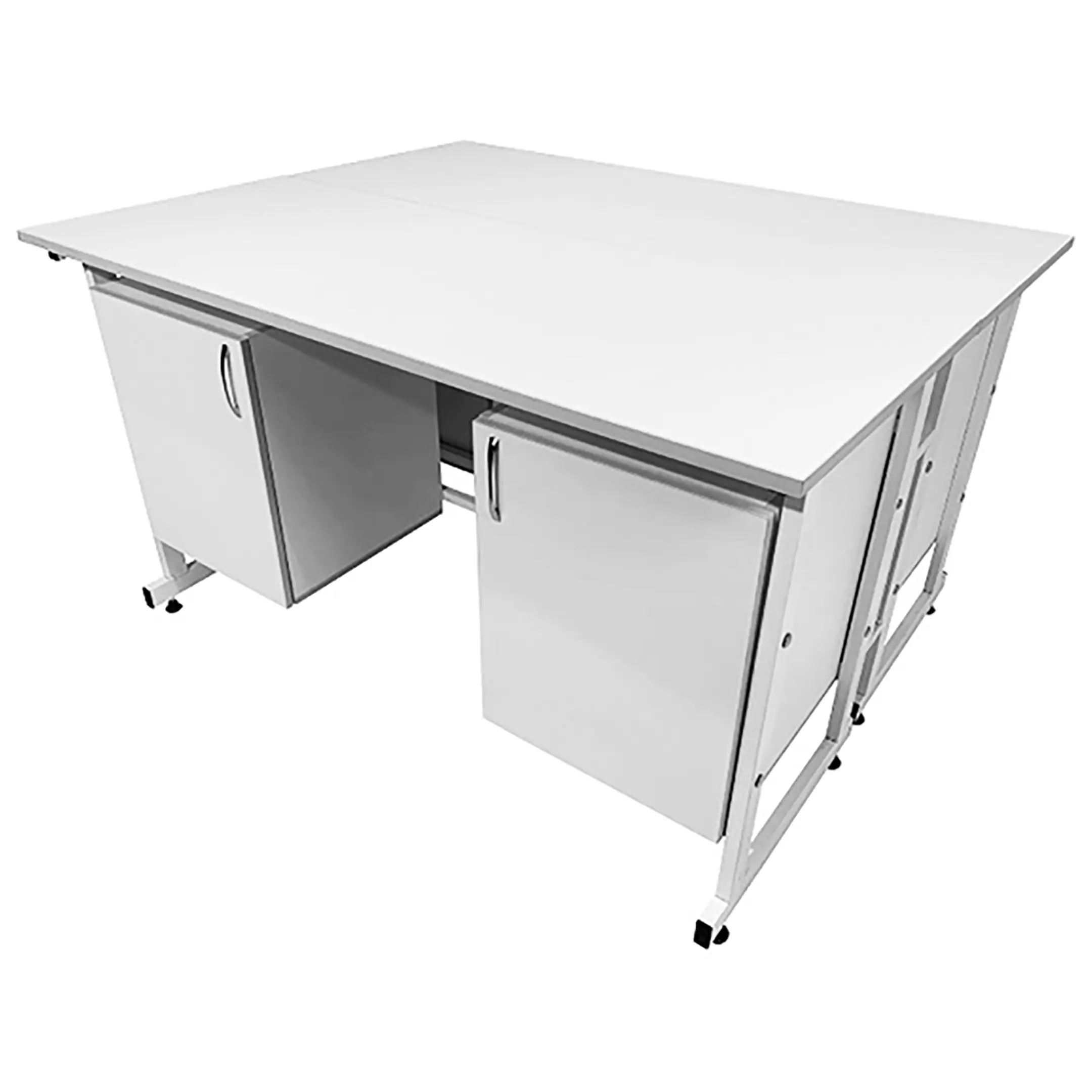 Стол лабораторный островной Сло 22.004 (белый) — это оптимальное решение для организации двух рабочих мест в лабораториях и медицинских учреждениях, способствующее рациональному использованию доступного пространства. Модель оснащена двумя рабочими местами, каждое с двумя подвесными тумбами с распашными дверками и полками. Каркас выполнен из стального профиля, столешницы из ЛДСП толщиной 22 мм.
