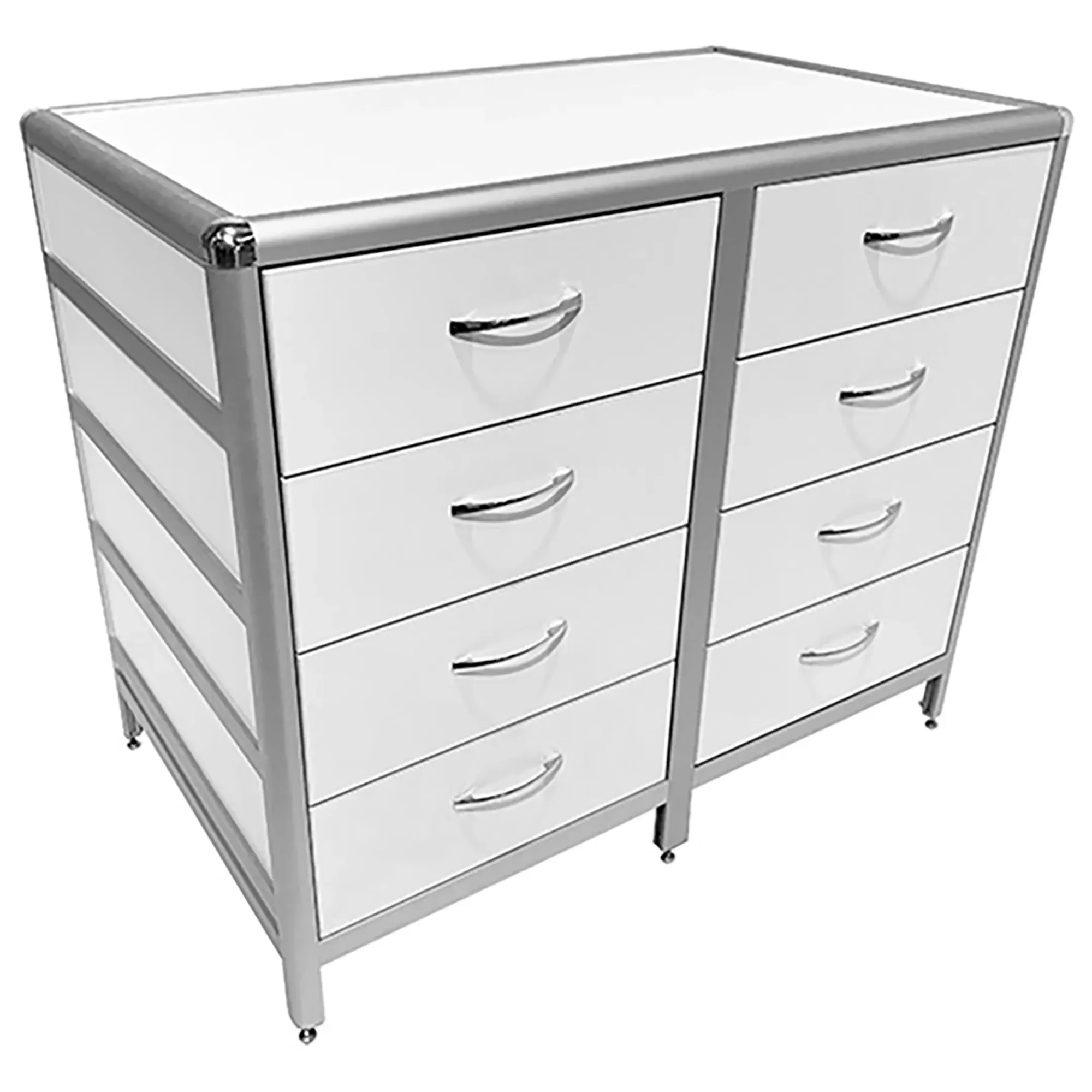 Стол-тумба лабораторная MED 12.014al (белый) — это функциональное решение для хранения лабораторного инвентаря, приборов и материалов в лабораториях и медицинских учреждениях. Модель оснащена двумя вертикальными рядами выдвижных ящиков (всего 8 штук) размером 434х70х406 мм. Каркас выполнен из алюминиевого профиля, столешница из ЛДСП толщиной 16 мм.