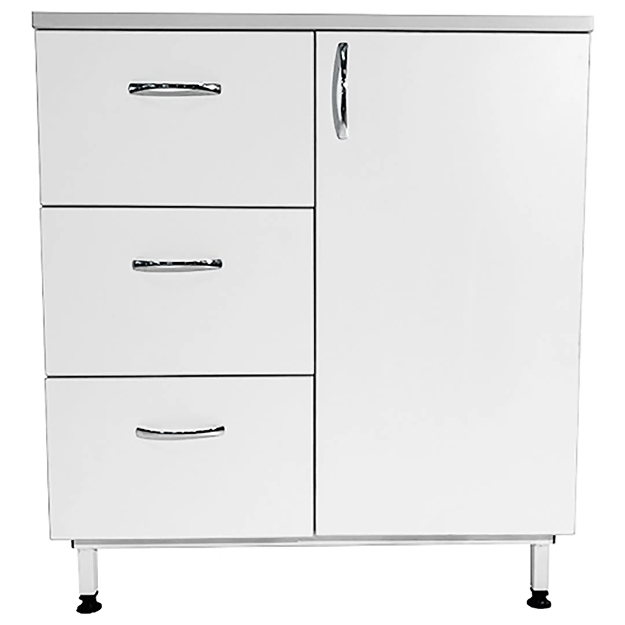 - Комбинированная система хранения — три выдвижных ящика и отделение с дверкой и полкой для удобного размещения различных материалов.