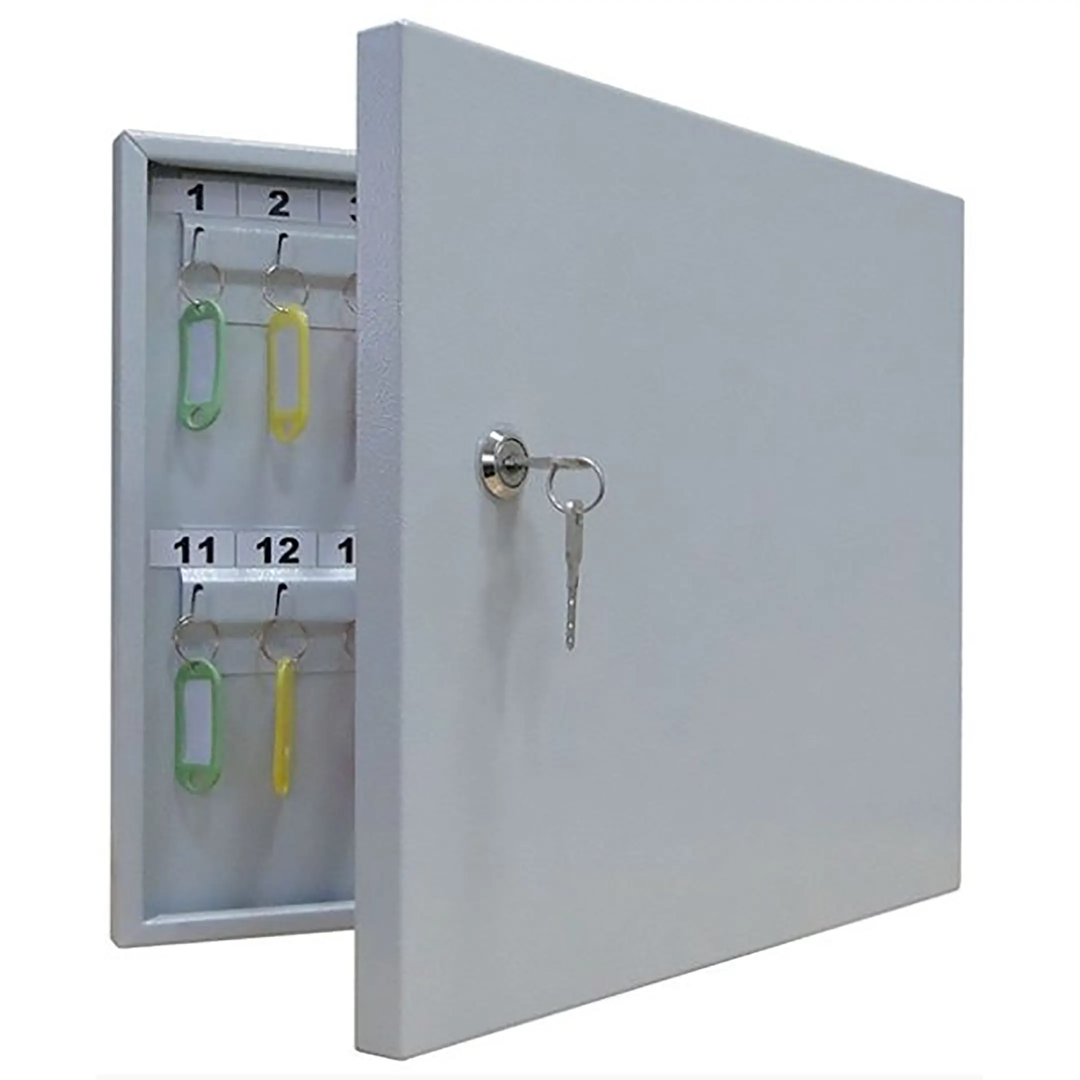 - Компактность и достаточная вместимость для типовых задач — ключница рассчитана на хранение 40 ключей, что является оптимальным решением для объектов с ограниченным количеством помещений, таких как небольшие офисы, студии, салоны, кабинеты или пункты приема клиентов. Ее размеры позволяют легко разместить шкаф на стене в удобном месте, не занимая много пространства.