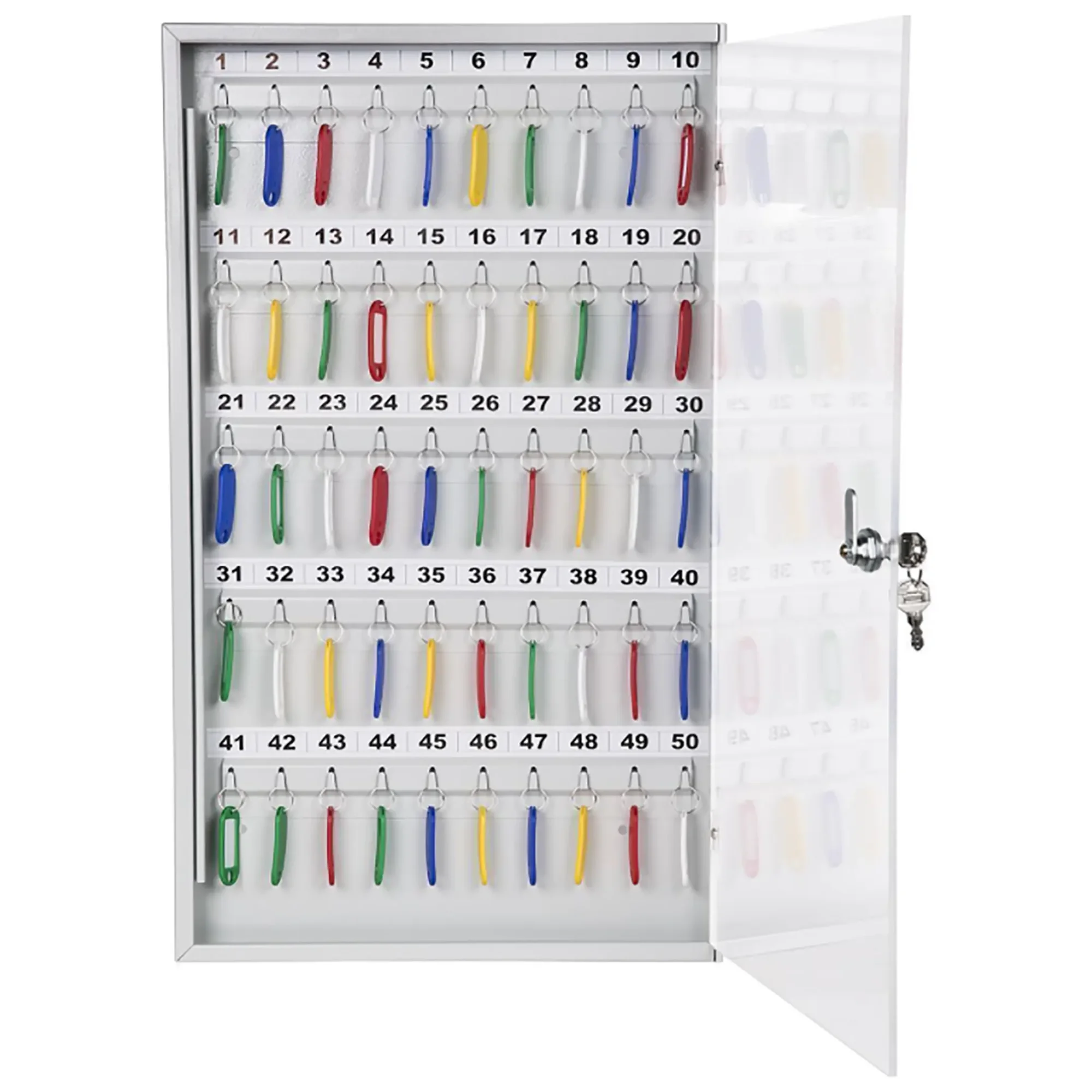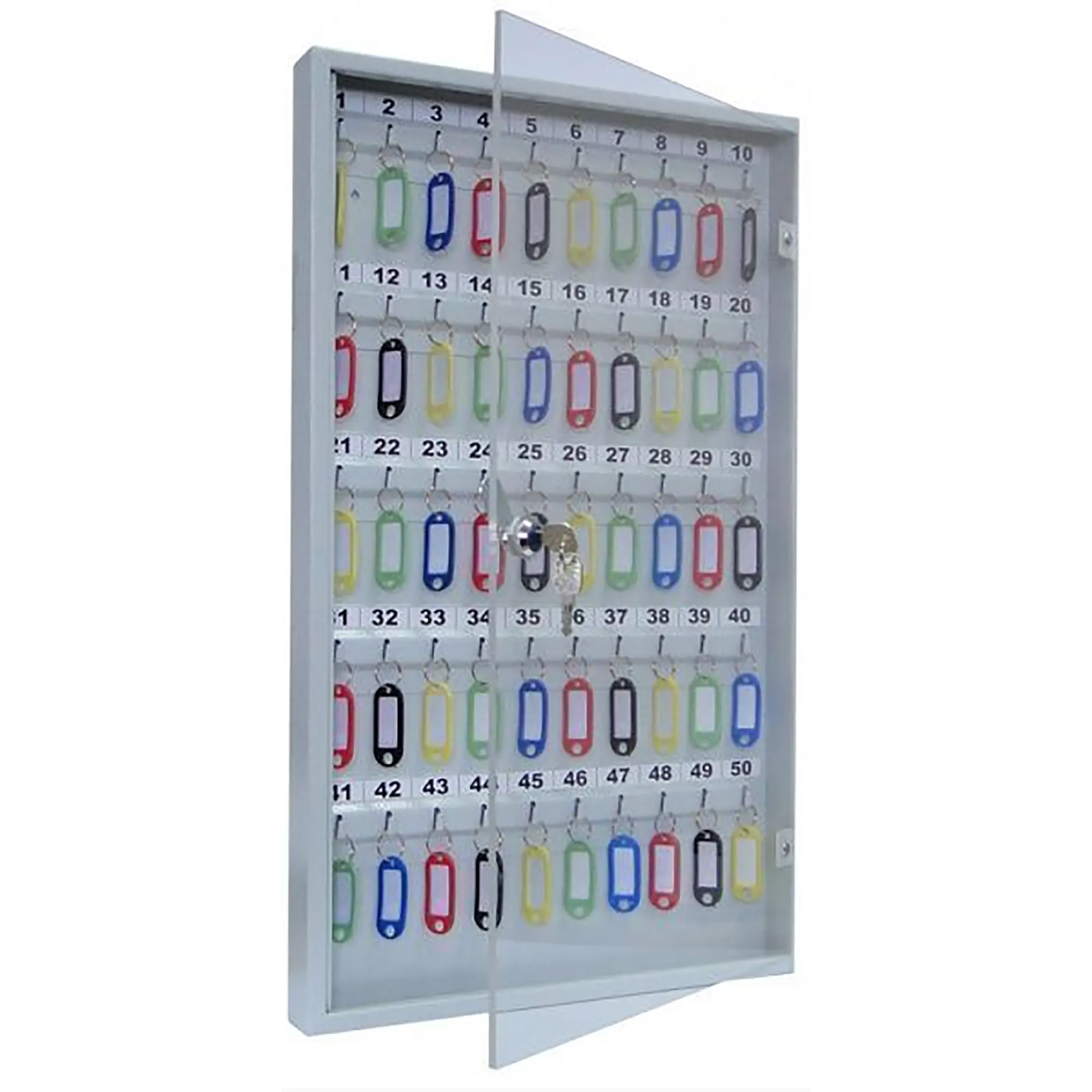 Ключница с прозрачной дверцей КЛС-50 (с брелками) — это практичная и наглядная система для организованного хранения ключей в учреждениях и на предприятиях. Конструкция со стеклянной дверцей и полным комплектом брелков обеспечивает удобный визуальный контроль, быстрый поиск и надежную защиту для 50 комплектов ключей.