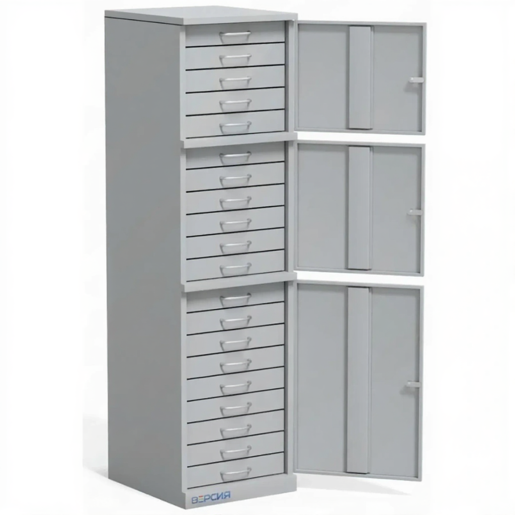 Шкаф для ключей (20 ящиков, 3 дверы) — это профессиональное и высокоорганизованное решение для комплексного учета, архивирования и контроля большого количества ключей, карточек доступа или мелких ценных предметов в службах безопасности, на предприятиях, в гостиницах и административных учреждениях. Модель представляет собой напольный металлический шкаф, где конфигурация «20 ящиков, 3 двери» указывает на его высокую функциональность: три запирающихся секции, каждая из которых содержит несколько выдвижных ящиков для детальной систематизации. Конструкция предназначена для обеспечения максимального порядка, конфиденциальности и эффективного управления ключами в условиях интенсивного документооборота и строгого контроля доступа.