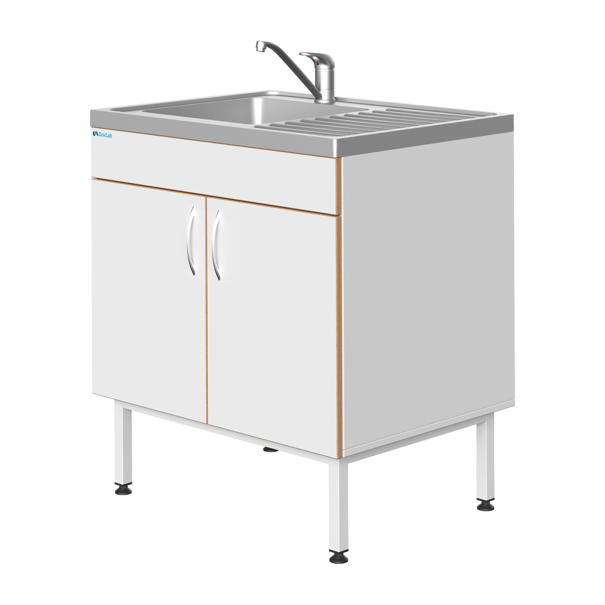 Мойка СОВЛАБ 800 НЖ, нерж — это компактное специализированное лабораторное оборудование, предназначенное для качественной и безопасной мойки лабораторной посуды, приборов и инструментов. Модель оснащена одинарной чашей из нержавеющей стали, объединенной в единый блок со столешницей, смесителем и всей необходимой арматурой для подключения к инженерным сетям. Тумба из влагостойкого ДСП установлена на прочный металлический каркас с регулируемыми опорами.