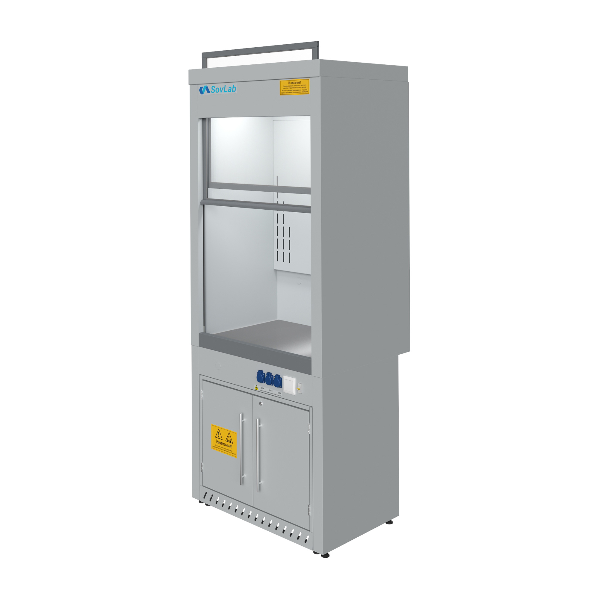 - Защитный экран — подъёмная панель с противовесами обеспечивает безопасный доступ к рабочей зоне при выполнении лабораторных операций.