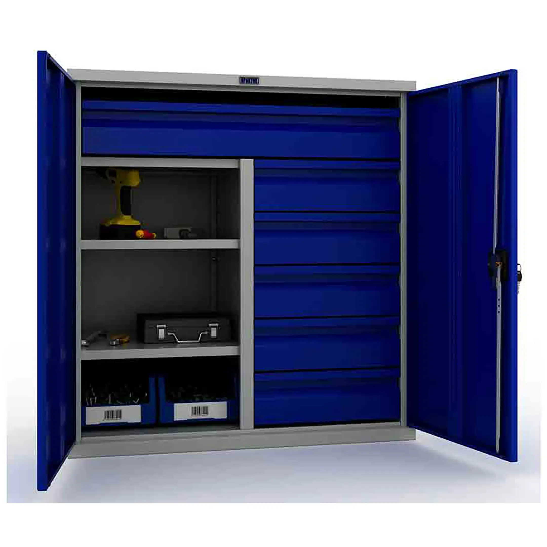 - Оптимизированная организация и высокая вместимость — шкаф спроектирован для хранения обширного инструментального парка. Комбинация выдвижных ящиков разной высоты и отделений с полками позволяет рассортировать инструмент и оборудование любого размера и веса: от мелких сверл и метизов до крупных электроинструментов и измерительных приборов. Каждому предмету находится свое логичное место.