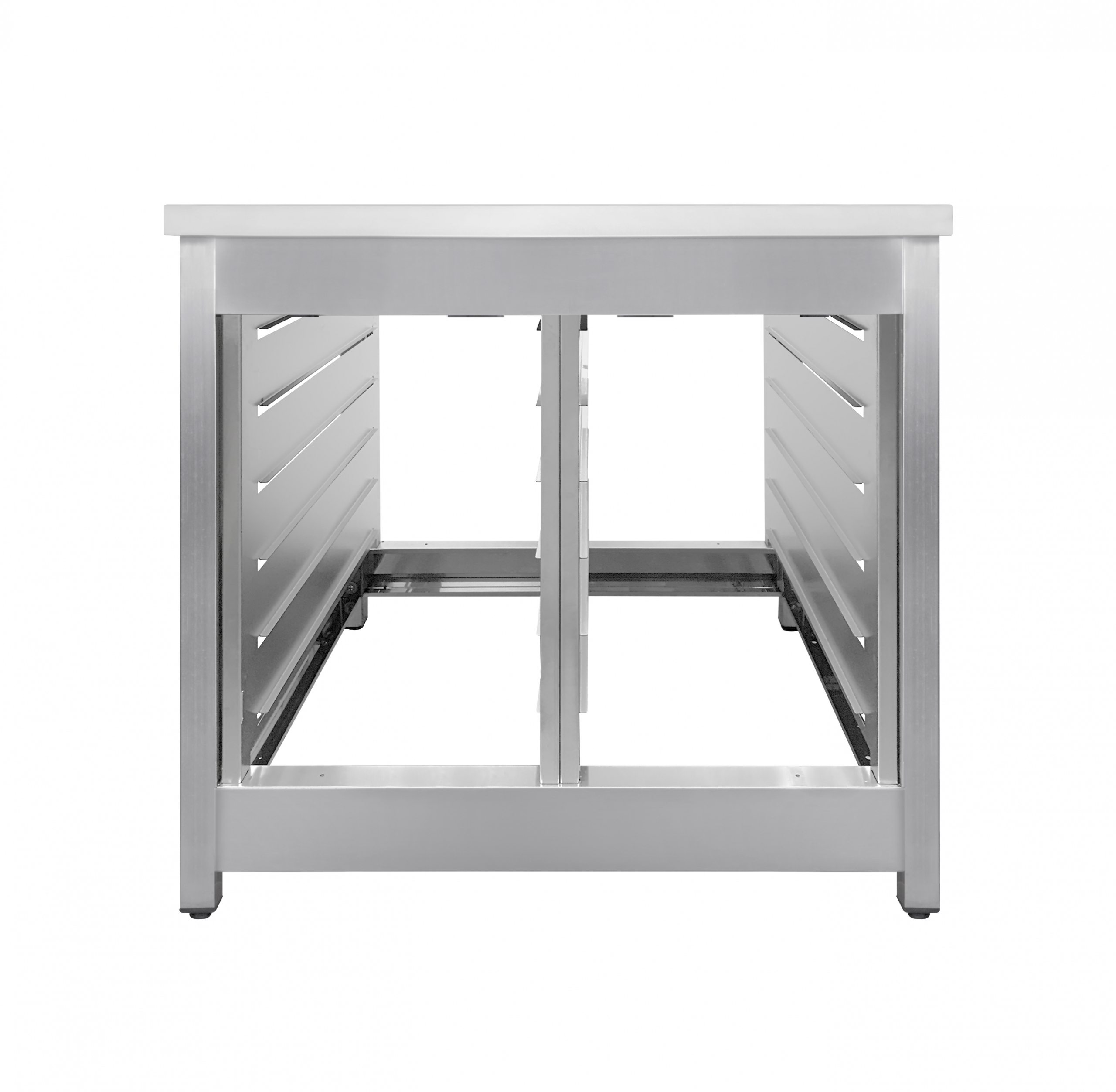 Держатели снизу используют для размещения гастроемкостей и пекарских листов. Ножки регулируются по высоте для компенсации неровностей пола.