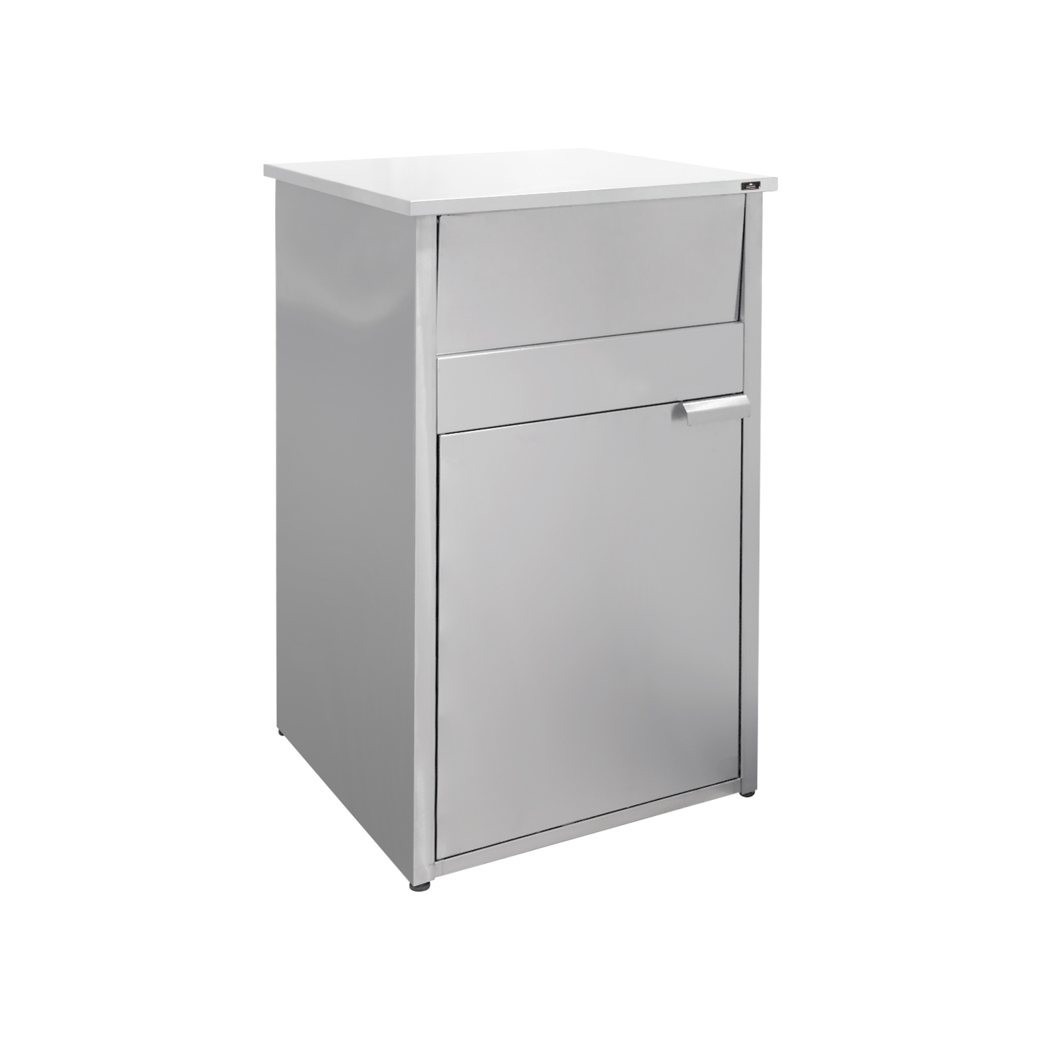 Урна для фуд-корта Atesy УФ-610/1065 предназначена для сбора мусора в залах приема пищи заведений быстрого питания. Столешница урны предназначена для сбора грязных подносов. С фасадной стороны сверху расположено отверстие для сброса мусора, закрытое качающейся дверцей.