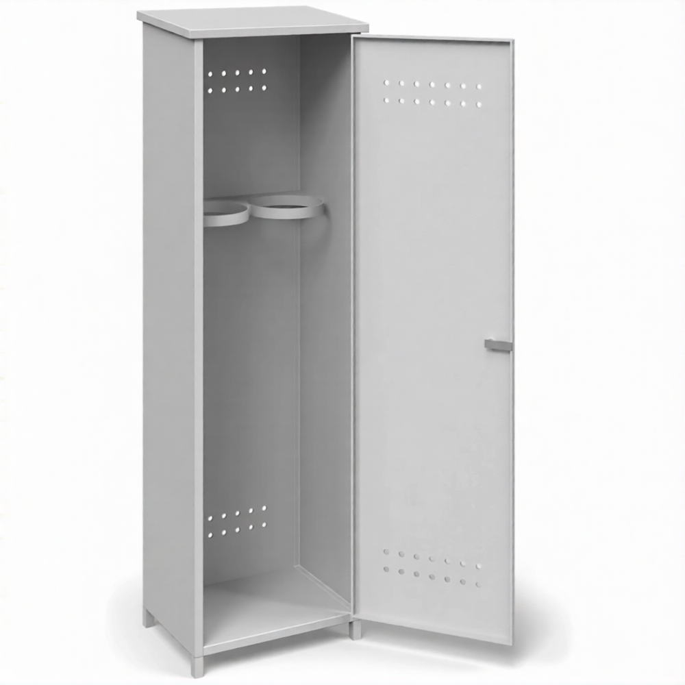 - Специализация для баллонов большой емкости — шкаф разработан с учетом габаритов и массы стандартных 40-литровых баллонов. Его внутреннее пространство, конструкция и система фиксации обеспечивают безопасное и устойчивое вертикальное хранение двух таких баллонов, что является стандартом для большинства промышленных сварочных постов и систем газоснабжения.