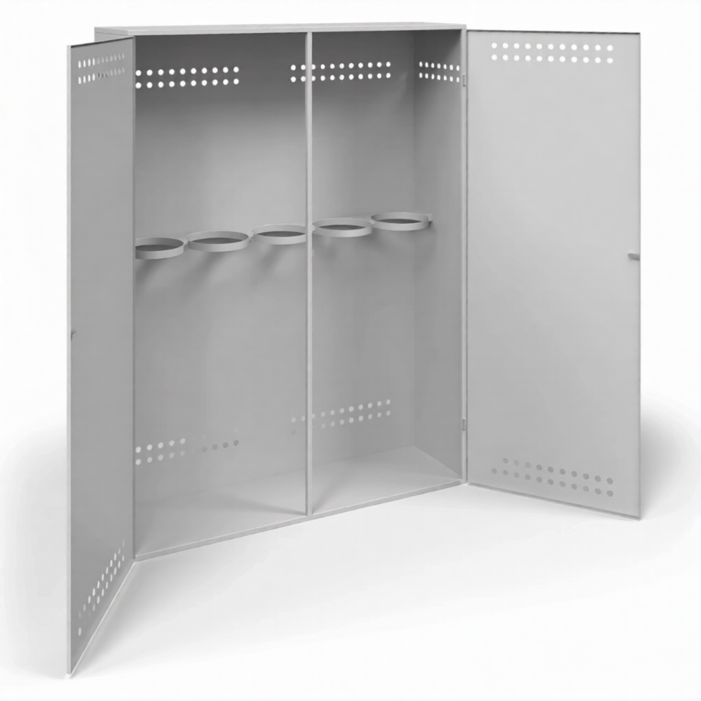- Обеспечение требований пожарной безопасности — усиленный металлический корпус служит надежным барьером, изолируя баллоны от возможных источников возгорания, искр и тепла. Наличие системы естественной вентиляции (перфорация или вентиляционные решетки) предотвращает образование взрывоопасной концентрации газа в случае утечки, что строго соответствует нормам ППР в РФ.